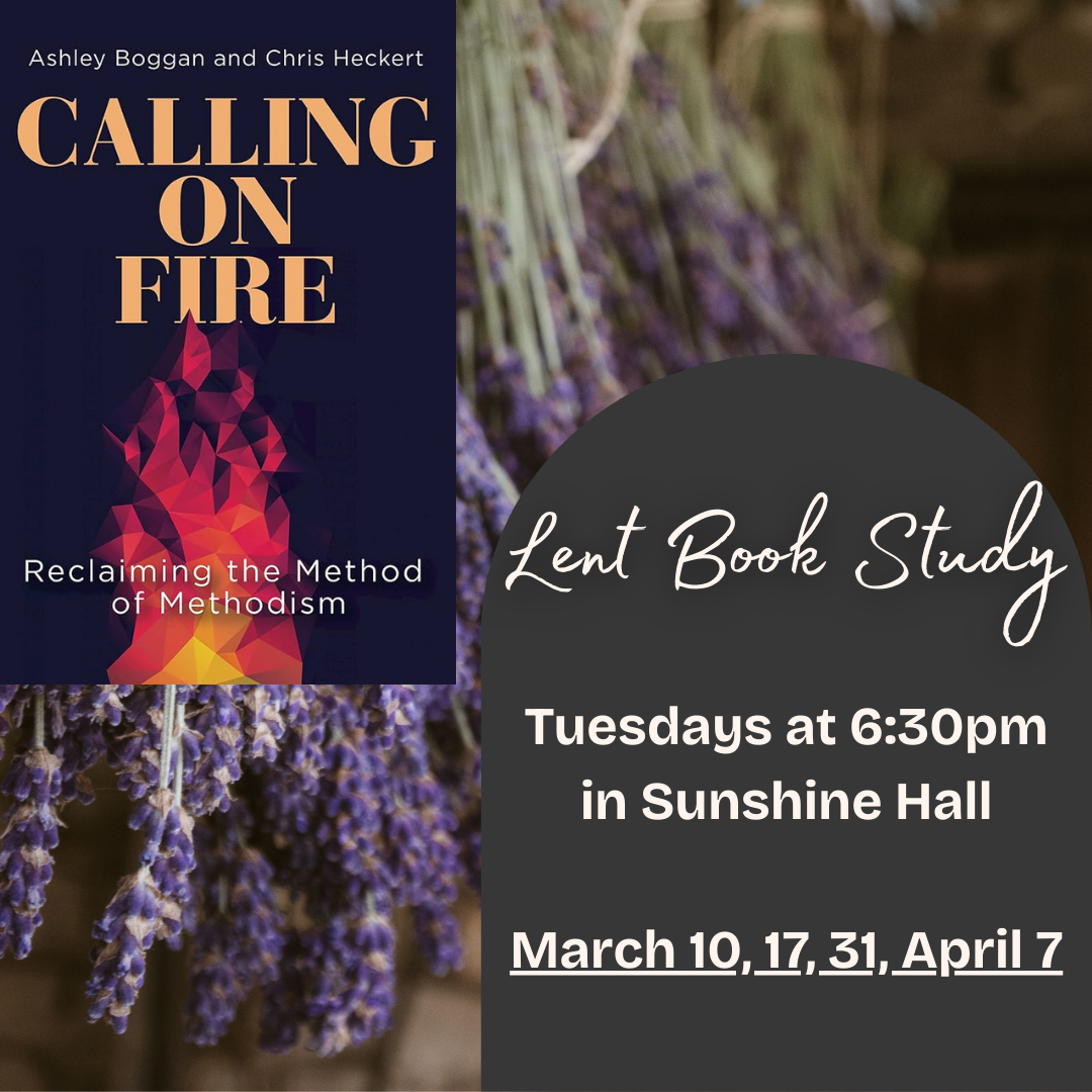 Pastor Jaime will be hosting a Lenten book study on Tuesday evenings at 6:30pm in Sunshine Hall, immediately following our weekly community dinner. The book is "Calling on Fire" by Ashley Boggan and Chris Heckert. The book is available for purchase on Amazon and Cokesbury (not necessary to join the book study, but helpful). We hope you are able to join in! Please contact Pastor Jaime with any questions.